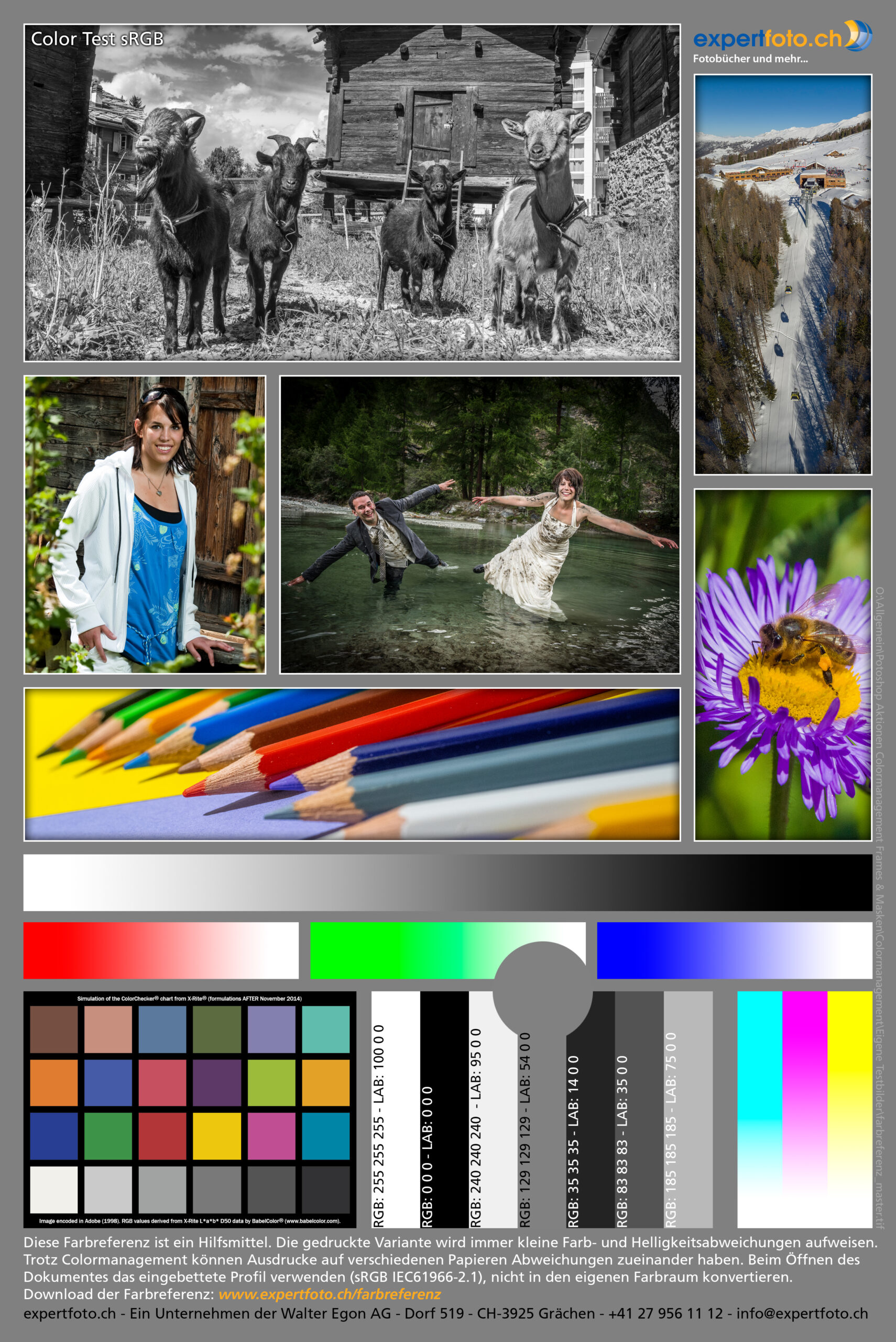 Ein Farbreferenzprint ist ein Hilfmittel. Die gedruckte Variante wird immer kleine Farb- und Helligkeitsabweichungen aufweisen. Trotz Colormanagement können Ausdrucke auf verschiedenen Papieren Abweichungen zueinander haben. Beim Öffnen des Farbreferenzprints das eingebettete Profil verwenden (sRGB IEC61966-2.1), nicht in den eigenen Arbeitsfarbraum konvertieren.